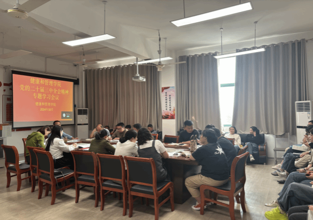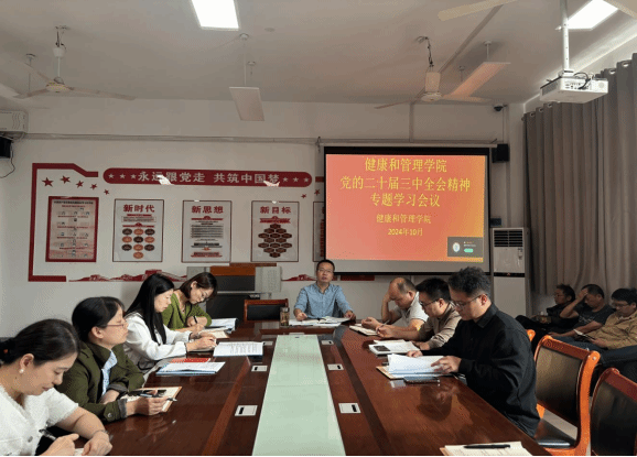 10 月 9 日下午,健康和管理学院在至善楼四楼会议室开展了学习贯彻党的二十届三中全会精神专题会议暨主题党日活动,会议由健康和管理学院负责人严岳峰主持,全体教师参加了此次会议。