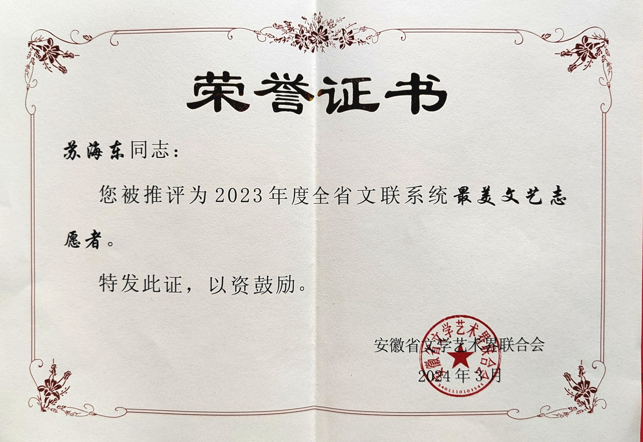 近日,安徽省文联公布了2023年度全省文联系统48家优秀单位、80名优秀个人的通报,我校教师苏海东荣获“最美文艺志愿者”荣誉称号。