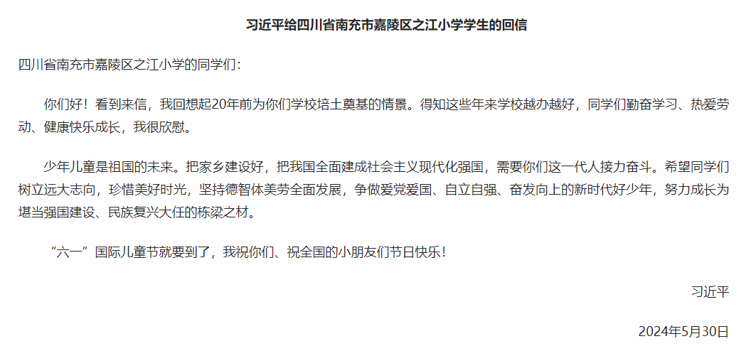 【重要转载】习近平回信勉励四川省南充市嘉陵区之江小学学生 坚持德智体美劳全面发展 争做爱党爱国自立自强奋发向上的新时代好少年 祝全国小朋友们“六一”国际儿童节快乐