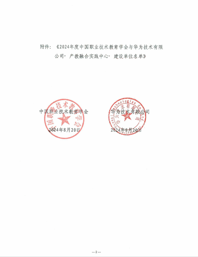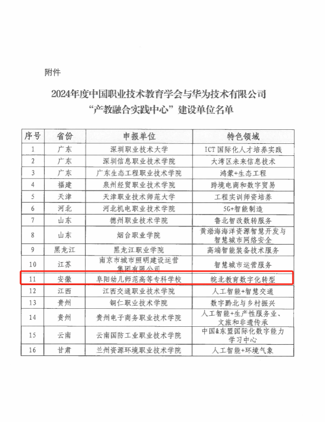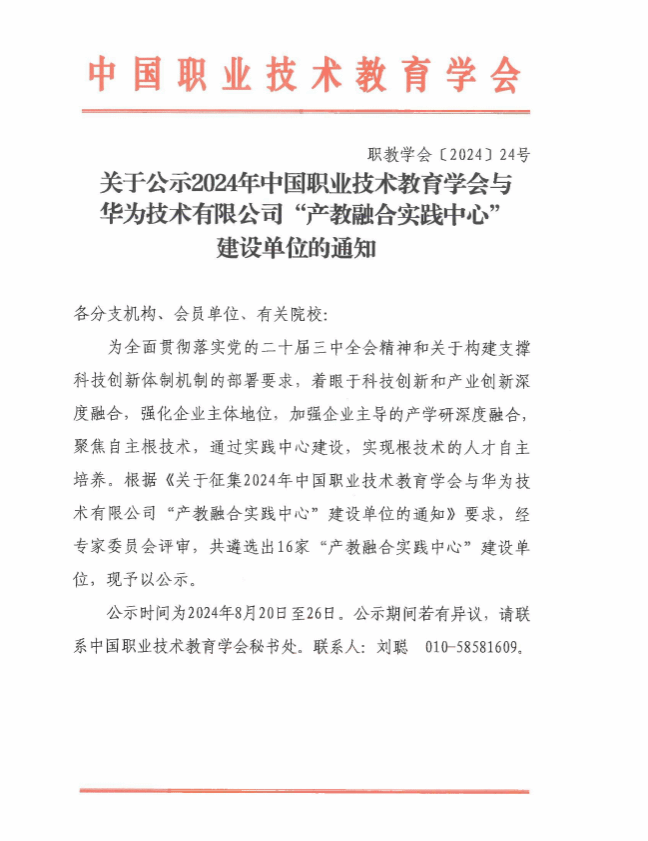 2024年6月,中国职业技术教育学会发布《关于征集2024年中国职业技术教育学会与华为技术有限公司“产教融合实践中心”建设单位的通知》,向全国征集建设院校。该项目由中国职业技术教育学会指导,依托华为技术有限公司在自主创新技术领域的领先优势,以教育部《开放型区域产教融合实践中心建设指南》重点任务和监测指标为参照开展遴选工作。我校以“皖北教育数字化转型”为课题参与申报,在全国多所高职院校中脱颖而出,与深圳职业技术大学、深圳信息职业技术学院等16所高校成为全国第二批“华为产教融合实践中心”建设单位,是安徽省第一所立项建设的高等学校。经过学校与华为公司共同建设,“产教融合实践中心”项目顺利通过验收,成为全国首批通过验收、获得授牌的9所高校之一。
