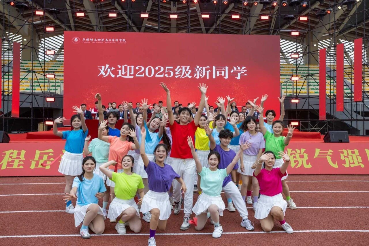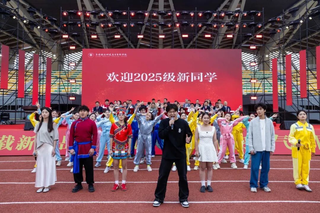 典礼现场全体新生身着校服,整齐列坐。我校大学生艺术团以优美的歌声与舞蹈点燃全场氛围,国旗挥舞,迸发出青春的光彩。