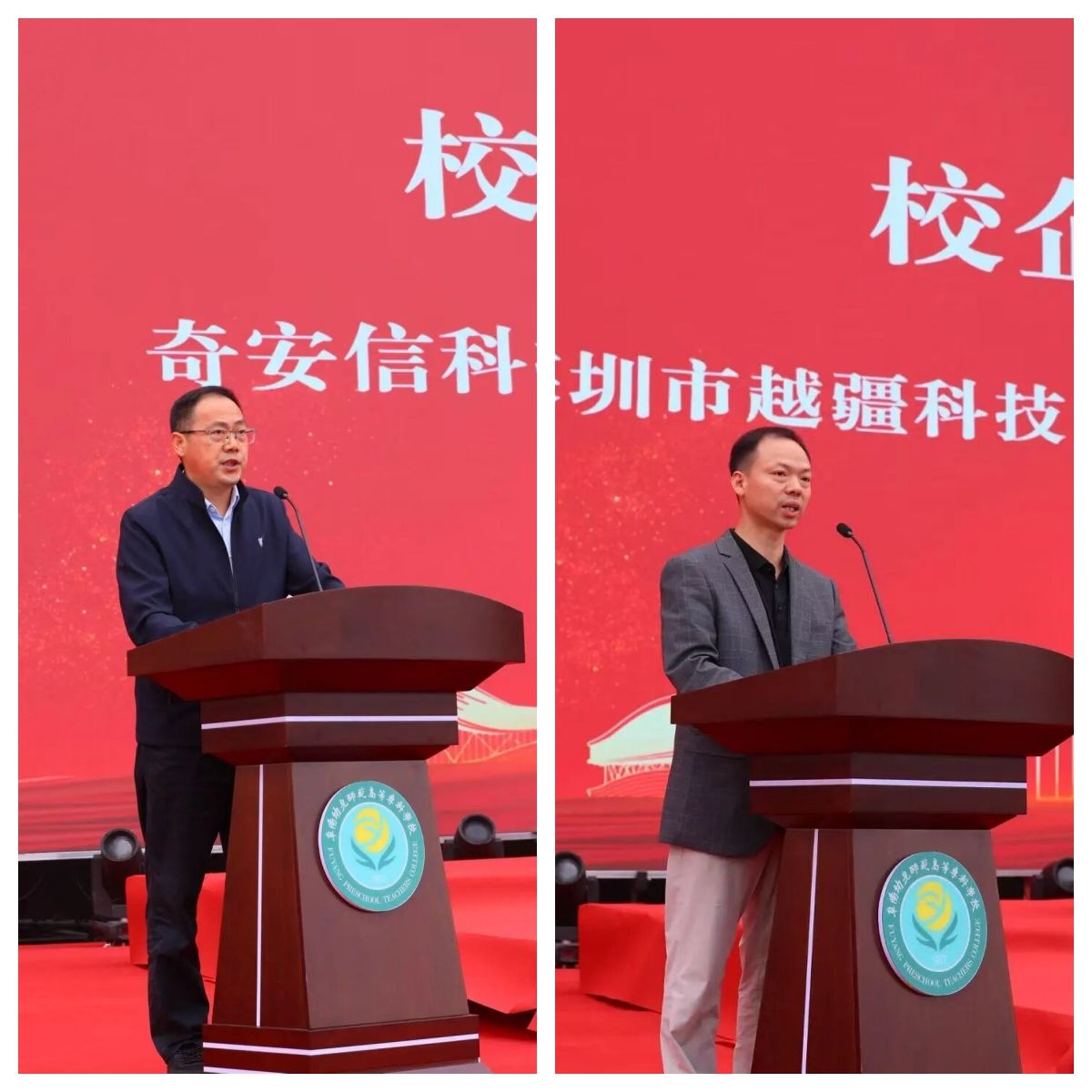 校企合作方代表,奇安信科技集团安徽分公司总经理汪珊林和深圳市越疆科技股份有限公司教育事业部副总曲余深发言致辞。