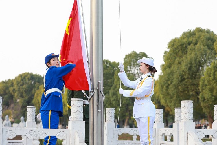 伴随着清晨的第一缕阳光,升旗仪式拉开序幕。在激昂的《义勇军进行曲》中,鲜艳的五星红旗冉冉升起,全体师生齐唱国歌,并向国旗行注目礼。