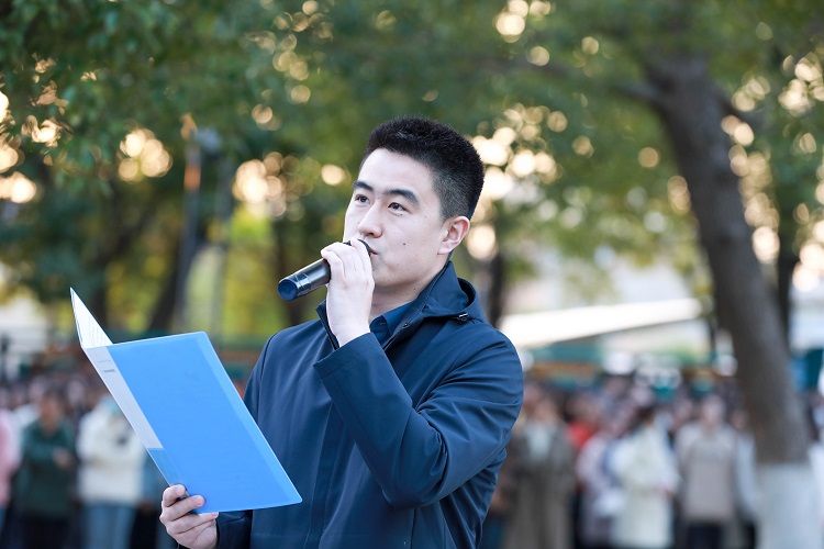 学生代表王浩同学在国旗下作《赓续奉献担当 传承雷锋精神》演讲。他表示,当代大学生要学习雷锋的“螺丝钉精神”,扎根在建设社会主义事业的一线,始终保持谦虚谨慎、不骄不躁、艰苦奋斗的作风,为社会主义现代化建设贡献新的力量。