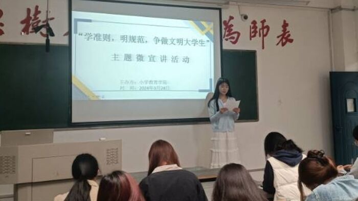 3月17日在文津楼301举行了“学准则、守规范、争做文明大学生”微宣讲活动。邀请院优秀学生会干部吴佳萱、优秀班干部汪雨洁、优秀团干部文相捷、三好学生陈珊开展了一场内容丰富的行为规范微宣讲活动。通过分享他们的先进事迹和成功经验,进一步弘扬正气,树立榜样,引导广大学生自觉遵守行为规范,培养良好的行为习惯和道德品质。